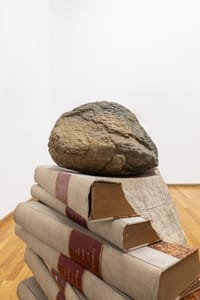 The exhibition is a deep exploration of the intersections between sculpture, text and memory. The main element of Marco Cordero's sculptures is a book, a real book, which the artist appropriates but reworks: hollowed out, burned, torn from its function as a book. In his work, the book becomes a living organism, an assemblage of materials that, through their combination, acquire a vital arrangement. In this exhibition, Marco Cordero links the fate of his books to rock, stone, and marble. This combination gives rise to surprising hybrids: books as rocks or rocks as books. The artist arranges these hybrids in various ways in the gallery space: he suspends them to reconstitute a skyline, he places them on the floor, he even combines them, for example, with a stone column that recalls one of the elements of the gallery's architecture.