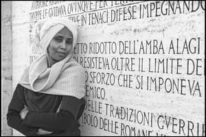 The cover image, taken on the Ponte del Duca di Aosta, features a female figure in in a mix of Western clothing and a traditional headdress, the portrait of a Somali woman leaning against the wall of the monument, where phrases of fascist rhetoric stand out.