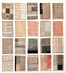 Le opere di Patricia Kelly nascono da una riflessione profonda sul legame tra gli esseri umani e la terra, intesa come spazio di memoria, identità e trasformazione. Cresciuta nella contea di Fermanagh, in Irlanda, l’artista traduce i paesaggi aspri e mutevoli della sua terra in linee cucite, dove il ricamo libero diventa gesto primario, sospeso tra astrazione e figurazione. L’uso di tessuti riciclati e materiali di recupero conferisce alle opere una dimensione tattile e stratificata, evocando pratiche rurali e familiari, mentre la poetica del wabi-sabi orienta la sua estetica verso la celebrazione dell’imperfezione e della transitorietà.