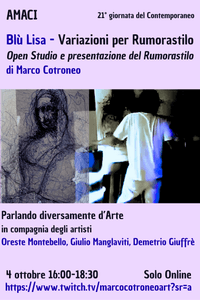 4/10 dalle 16:00 Marco Cotroneo aprirà il suo studio per parlare d'arte approfondendo sul suo Rumorastilo con il quale si esibirà in uno spettacolo inedito di modulazione grafica e sonora del segno. Ospiti esclusivi, amici e artisti. Show solo online in live streaming tramite il seguente link